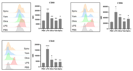 Effects of polysaccharides on BMDC maturation. Induced BMDCs were cultured, and five groups were set up: negative control of PBS, positive control of 1 μg/mL LPS, and 50 μg/mL of okra polysaccharide, yam polysaccharide, and spirulina polysaccharide. After 24 h of incubation, cells were collected, stained with anti-CD11c-APC, anti-CD80-PerCP-efluorTM 710, and anti-CD86-PE, and assessed via flow cytometry. * p < 0.05; ** p < 0.01; *** p < 0.001; ns, no significance.