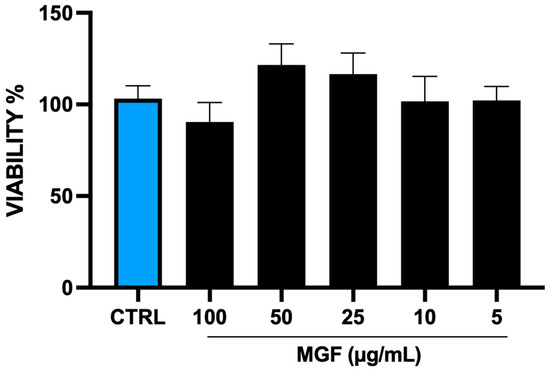 The cells were seeded in 96-multiwell plates and properly treated with different concentrations of MGF (30 μg/mL, 20 μg/mL, 10 μg/mL, 5 μg/mL, and 1 μg/mL). After 24 h of treatment, the medium was replaced by a solution containing bromide 3-(4,5-dimethylthiazol-2-yl)-2,5-diphenyltetrazolium (MTT) salts (Sigma–Merck Life Science, Milan, Italy) and incubated for 3 h at 37 °C. Finally, 100 μL of dimethyl sulfoxide (DMSO) (Sigma–Merck Life Science, Milan, Italy) was added to dissolve formazan crystals and the absorbance was detected at a wavelength of 570 nm [23].