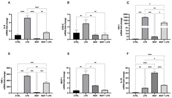 As shown in Figure 2, the exposure to LPS was able to induce the gene expression of the markers closely related to inflammation, such as interleukin 6 (IL-6), prostaglandin-endoperoxide synthase (COX-2), heme oxygenase 1 (HO-1), tumor necrosis factor-α (TNF-α) and monocyte chemoattractant protein-1 (MCP-1). Due to the post-treatment with MGF, the expression of such genes was significantly reduced. In addition, the MGF treatment alone strongly induced interleukin 10 (IL-10) levels, involved in anti-inflammatory processes (Figure 2F); the MGF administration following LPS pre-treatment was able to cause a slight, but significant, increase in the IL-10 level compared to LPS alone.