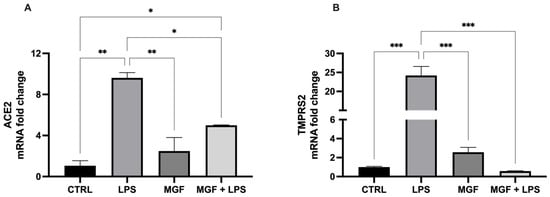 mRNA expression of ACE2 (A) and TMPRSS2 (B) in NCI-H292 cells. Cells were treated with LPS 10 μg/mL for 1 h, and with MGF 20 μg/mL for 24 h. * p < 0.05; ** p < 0.01; *** p < 0.001.