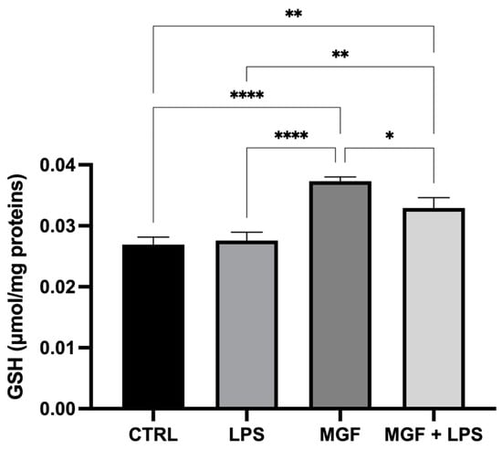 The results reported in Figure 4 show that MGF alone was able to increase GSH basal levels compared to the control. The co-treatment with MGF and LPS resulted in a minor enhancement of GSH levels, still regulating the oxidative stress occurring during the inflammatory condition, although the LPS single treatment did not affect the redox balance of the cells.