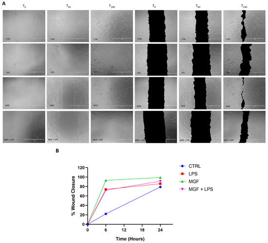 A standard wound healing test was used in order to study the impact of our treatments on wound repair capability. As shown in Figure 5, Panels A and B, the MGF treatment produced a significant increase in the wound closure rate compared to the control, from about 20% (CTRL) to about 90% at 6 h, and from about 75% (CTRL) to about 100% at 24 h. According to the literature, the LPS treatment enhanced the wound healing rate as well, despite not reaching the MGF rate (about 70% at 6 h and about 85% at 24 h). Finally, the MGF administration after the pre-treatment with LPS ameliorated the repairing rate compared to LPS alone, reaching about 90% at 24 h, despite not providing differences at 6 h.