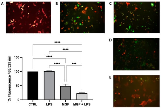 The higher presence of JC-1 monomer (green fluorescence) in LPS-treated cells, compared to CTRL and MGF groups, indicated mitochondrial dysfunction due to alterations in the mitochondrial membrane potential. As shown in Figure 6, the co-treatment of MGF and LPS was able to reduce the ratio of the red/green fluorescence signal, highlighting a protective effect of MGF against LPS-induced mitochondrial stress.