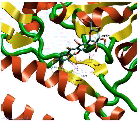 Docking position of MGF (2) at the accessory site between spike 1 (green and yellow) and ACE2 (red). Interactions with Thr27, Asn492, Tyr453, and Asp406. Water and accessory parts of spike and ACE2 were omitted for clarity.
