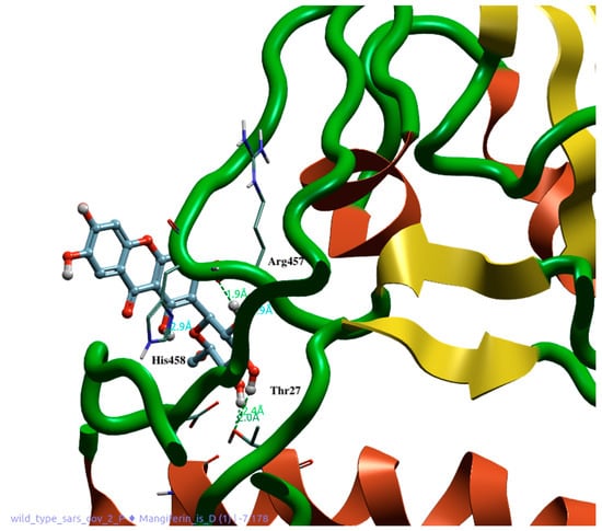 Molecular docking and dynamics studies provided very interesting results. In fact, they show how a naturally derived polyphenol can interfere with the binding between the SARS-CoV-2 spike protein and ACE2 receptor, thereby preventing the entry of the virus into the cells. MGF shows excellent dG (−8948) and VSscore (−10,115), and its structure, which contains several phenolic groups, allows the establishment of several bonds with the amino acids of the spike protein. The hydroxylic groups in MGF form very stable hydrogen bonds with Asp406 and Asn492 (Figure 8). The molecule also maintains its position through the Ar–Ar bond between the compound rings and the phenolic portion of Tyr453. The molecule also establishes hydrogen and Ar–Ar bonds with His34 of the ACE2 protein. The presence of a second accessory pocket was revealed using the Flare software during the pre-docking analysis of the complex. This pocket appears to be important for the stability of the anchorage of the spike on the ACE2 surface because a number of bonds were revealed between these two; therefore, we decided to evaluate the action of mangiferin on this pocket. The glycosidic portion of the second molecule throughout the dynamics establishes H-bonds with Arg457 and His458 of the spike protein and Glu23 and Thr27 of the ACE2 protein, leaving the aromatic portion and hydroxyl groups at the interface with water (Figure 9).