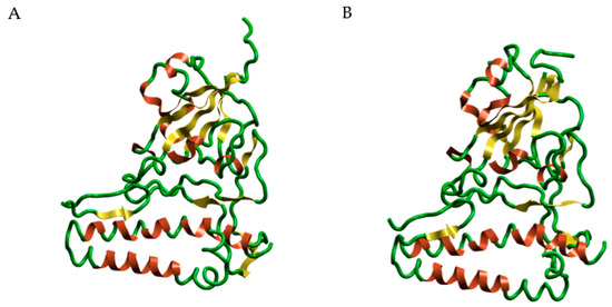 Dynamics studies of MGF (1) and MGF (2) with synergic activity. Panel (A) shows the normal structure of the amino acid from Gln388 to Ala443. Panel (B) shows the structure of the same portion after the disrupting activity of the synergism of the two MGF molecules. Water and accessory parts of spike and ACE2 were omitted for clarity.