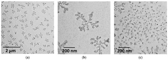 TEM images of a highly diluted chitosome solution are shown in Figure 3. The size of uniformly distributed dendrimer-like aggregates is in the region of 200 nm. If each individual aggregate in this structure is evaluated, strongly aggregated small particles in the region of 20 nm are observed. It was discussed in [] that the aggregation of chitosomes can decrease with an increase in the Cs concentration (at least 0.8%). At higher concentrations, additional cross-links between polymers can form, which contributes to aggregation and an increase in particle size. However, dendrimer-like structures are not observed on the entire surface of the copper grid; in Figure 3c, aggregates no larger than 20 nm in size are seen over the entire field. Such aggregates were called quasi-spherical [,]. The phenomenon of size reduction and discrepancies in the results shown by TEM and DLS are common [] since the sample drying, namely, the removal of water from the inner core and outer shell, can affect the reduction in particle size. In addition, the DLS also determines the hydration shell around the particles [].