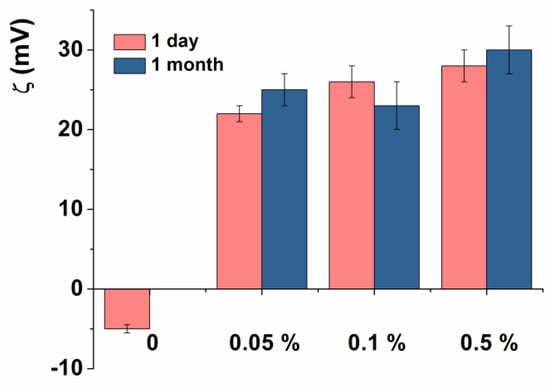 It has been demonstrated that the modification of liposomes leads to a change in the zeta potential from negative to positive values (Figure 4). A similar trend was also observed for empty chitosomes. Figure 4 and Table 3 show the dimensions and zeta potential of chitosomes during storage for 1 month at 4 °C. As can be seen, liposomes coated with Cs were significantly more stable during long-term storage than uncoated liposomes.