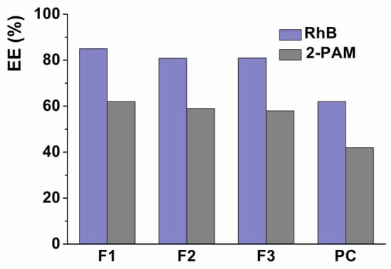 An important characteristic of nanocontainers is encapsulation efficiency (EE). The EE of hydrophilic molecules is regulated by the size of lipid vesicles since an increase in size leads to an increase in the volume of the liposome aqueous phase []. As can be seen (Figure 5), the loading of RhB and 2-PAM into chitosomes increases EE by 20% compared to conventional liposomes. This result is similar and consistent with the data of other authors []. The polymer likely covers the substrates that are on the liposome surface, which leads to an increase in EE [].