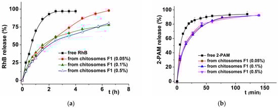 RhB (a) and 2-PAM (b) release curves in vitro from F1 chitosomes at different Cs concentrations; phosphate buffer (0.025 M), pH = 7.4, 37 °C.