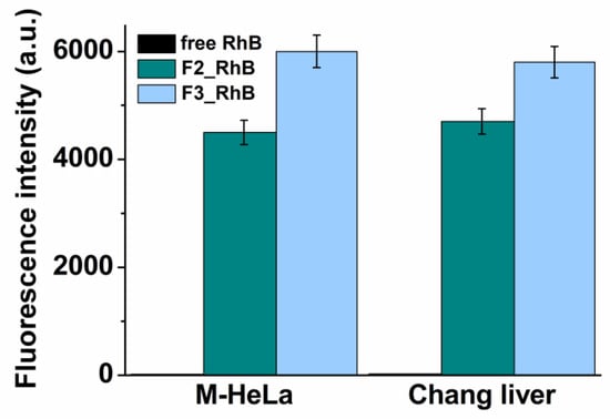 Cellular uptake or internalization is one of the most important physicochemical criteria for nanoformulations to consider before in vivo experiments. The ability of chitosomes to penetrate the cell was determined using flow cytometry with M-HeLa and Chang liver cell lines. Normal Chang liver cells were used as models of epithelial cells. A necessary condition for determining the internalization of nanocontainers into cells is the use of fluorescent probes, in this case, RhB. Figure 7 shows the average fluorescence intensity of free RhB and encapsulated in F2 conventional and F3 arginine chitosomes. The results were evaluated 24 h after the treatment of cells with diluted solutions. According to the results, the fluorescence of the encapsulated RhB significantly exceeded the fluorescence intensity of the free dye on both cell lines. At the same time, in the case of arginine chitosomes, the fluorescence intensity was 25% higher compared to the unsubstituted Cs analogue.