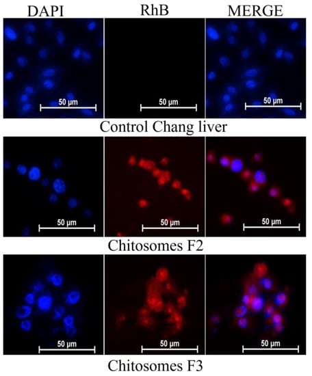 In vitro cellular uptake study of RhB-loaded chitosomes; (F2 and F3); Chang liver cell line. Blue channel: DAPI fluorescence (nuclei); red channel: RhB fluorescence (chitosomes).