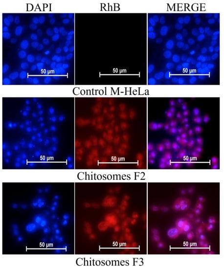 In vitro cellular uptake study of RhB-loaded chitosomes; (F2 and F3); M-HeLa cell line. Blue channel: DAPI fluorescence (nuclei); red channel: RhB fluorescence (chitosomes).