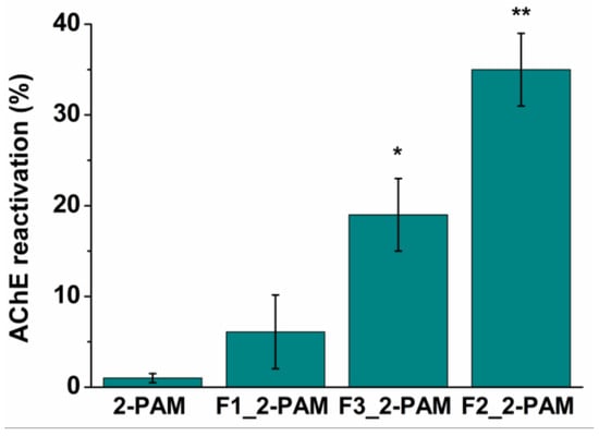 AChE reactivation rate after intranasal administration of free and formulated 2-PAM (13 mg/kg) in vivo. Data are presented as mean ± SE. (n = 5). * p = 0.017, ** p = 0.006 indicates significant difference by Mann–Whitney test.