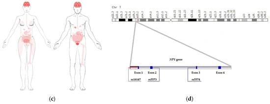 NPY is encoded by the NPY gene. This gene is localized on chromosome 7p15.3 and is approximately 8 kilobases in length, with four exons and three introns (Figure 1d) []. The highest expression of NPY is observed in the brain, endocrine tissues, prostate, adipose and soft tissue (Figure 1b,c). The single-nucleotide variants (SNVs) rs16147 (4604T>C) in the promoter region, rs5573 (6203G>A) in exon 2 and rs5574 (10327C>A) in exon 3 of the NPY gene are of the most interest for AIWG prediction [].