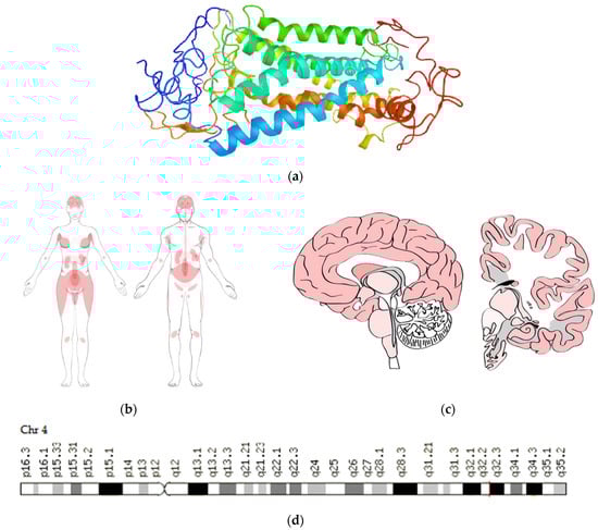 Structure (a) and tissue expression (b,c) of a neuropeptide Y receptor Y5 []; chromosome location of the NPY5R gene (d) [].