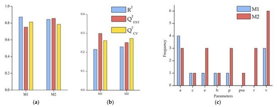 M1 and M2 obtained from SS_1213 and CSE_1393 set of descriptors. (a) presents the R2, Q2CV, and Q2EXT values; (b) MAE values; and (c) is the frequency of the physicochemical properties within the descriptors for M1 and M2.