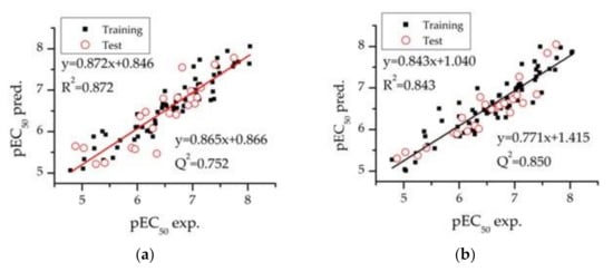 Additional statistical parameters demonstrate proper fitting of the models. Models M1 and M2 are presented in Equations (2) and (3), respectively. Q2boot is the pEC50 prediction obtained by a based perturbation. The values of Q2boot > 0.7 suggest that the dataset’s correlation fitting does not affect the perturbation. a(R2) and a(Q2) were obtained from Y-scrambling analysis and their small values suggest the pEC50 prediction does not occur by chance. M1 and M2 are well-fitted models based on the high value of the Fisher’s statistical test (F > 27), the slight standard deviation (s < 0.334), and the correlation between predicted and experimental pEC50 (Figure 3).