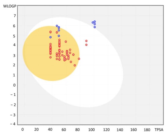 SwissADME (http://www.swissadme.ch (accessed on 18 February 2021)) was used to calculate physicochemical properties, lipophilicity, water-solubility, pharmacokinetics, drug-likeness, medicinal chemistry properties, and bioavailability score of the molecules. Bioavailability is a fast screening in the compounds to evaluate the possibility to be considered an oral drug [64]. All the compounds have a high bioavailability score of 0.85 in the dataset. The lipophilicity obtained from Wildman and Crippen method (WLOGP) and the topological polar surface area (TPSA) were used to construct the BOILED-Egg (Figure 4). The Boiled egg is a plot of WLOGP vs. TPSA and predicts the gastrointestinal absorption (HIA) and brain penetration (BBB). The four molecules (46, 50, 51, and 53) in the grey region are predicted to have poor intestinal absorption and brain penetration. P-glycoprotein substrates (Pg-p) is a restrictive barrier to maintain homeostasis of the brain and is key among ATP-binding cassette transporters. The red and blue dots are p-glycoprotein substrates (PGP+) and P-glycoprotein non-substrates (PGP−), respectively [65].