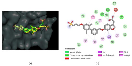 The interactions of the positive controls occur mainly with Ala-83, Val-84, Tyr-91, Leu-138, Phe-142, Leu-171, and Arg-183. The interactions of TAK-875 and compound 15 with FFA1 are shown in Figure 5b and Figure S2a, respectively. The carboxylic group in TAK-875 forms hydrogen bonds (HBs) with Tyr-91, Arg-183, and Arg-258. Arg183 and Arg-258 were reported in the literature as essential to anchor ligands containing carboxylate groups, while Tyr91 was reported to produce aromatic/hydrophobic interactions with the ligand [26].