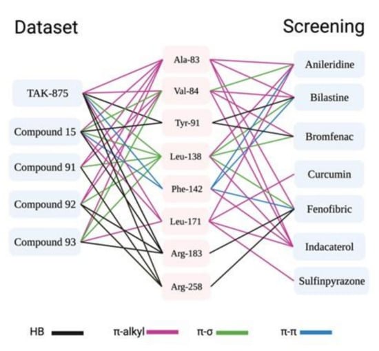 The interactions between ligands and amino acids linked to FFA1 activation, high potency, and stabilization are shown in Figure 6. HBs are essential in the stabilization of the ligand–protein complex and FFA1 activation. Tyr-91, Arg-183, and Arg-258 were reported as relevant residues for the activation of the FFA1 [26]. Tyr-91 forms HB with compound 15, TAK-875, bilastine, and bromfenac. Arg-183 forms HBs with all compounds from the dataset and fenofibric acid. Arg-258 form HBs with compound 91, 92, TAK-875, and fenofibric acid. Interestingly, compounds 91, 92, and 93, the most actives compounds in the dataset, do not form hydrogen bonds with Tyr-91. On the other hand, Val-84 and Leu-138 seem to play an essential role during binding as they form π interactions with most of the compounds shown in Figure 6.