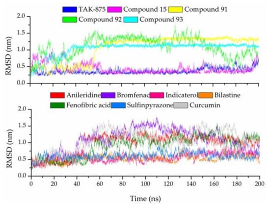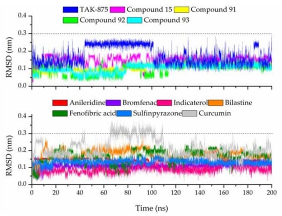 The RMSD values of the ligands below the threshold (dotted line 0.30 nm) mean the optimized structures found on the docking analysis were appropriate (Figure 8). The RMSD of the ligands suggests the stability of the system during the trajectory. TAK-875 RMSD “jumps” between 50–100 ns and 185–190 ns due to a fluctuation on the methylsulfonyl tail. Curcumin RMSD goes above the threshold moving outside the active site during the simulation. Therefore, curcumin was taken out for further analysis.