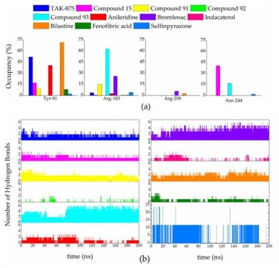(a) Occupancies and (b) number of hydrogen bonds between FFA1 and the studied compounds during the 200 ns simulation.