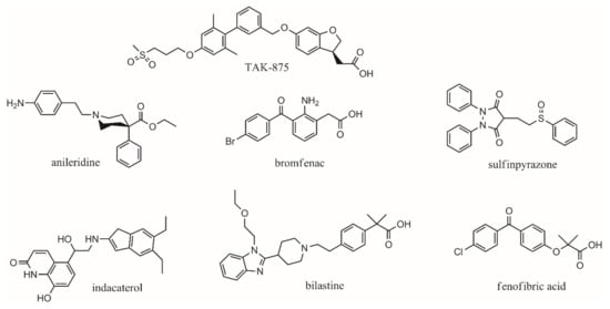 - Christiansen, E.; Urban, C.; Merten, N.; Liebscher, K.; Karlsen, K.K.; Hamacher, A.; Spinrath, A.; Bond, A.D.; Drewke, C.; Ullrich, S. Discovery of potent and selective agonists for the free fatty acid receptor 1 (FFA1/GPR40), a potential target for the treatment of type II diabetes. J. Med. Chem. 2008, 51, 7061–7064. [Google Scholar] [CrossRef] [PubMed]