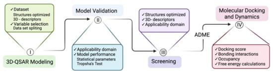 In this article, new FFA1 agonists are proposed based on an in silico analysis. Lipophilicity and interaction with FFA1 of the suggested drugs were studied using QSAR, molecular docking, and molecular dynamics simulation. In this sense, a diverse dataset of 93 FFA1 agonists reported by Christiansen et al. [17,18,19,20] was used to build a model. The pIC50 of the molecules of the dataset, DiaNat [27], and DrugBank 5.1.7 (https://www.drugbank.ca/ (accessed on 18 February 2021)) [28] databases were predicted. In addition, a computational analysis of absorption, distribution, metabolism, and excretion (ADME) parameters was performed to explore lipophilicity, the effectiveness of the drug, and the affinity to reach the target site [29]. Finally, the crystal structure of FFA1 was used (PDB: 4PHU) for molecular docking and molecular dynamic simulations [30,31].