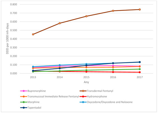 Evolution of strong opioids DDD per 1000 inhabitant-days by active substance. DDD: defined daily dose.
