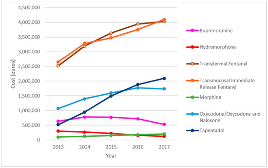 Transdermal fentanyl and transmucosal immediate release fentanyl (TIRF) were the main cost components. Expenditure on TIRF rose from €2,654,919 in 2013 to €4,097,149 in 2017, an increase of 54%, and that on transdermal fentanyl rose from €2,522,131 in 2013, to €4,033,144 in 2017, an increase of 59.9%. Expenditure on tapentadol increased by 303% (from €518,211 in 2013, to €2,093,121 in 2017). Total spending on SO increased by 60.88% in the study period. Analysis of the total amount spent on SO during the study period (€54,380,141.76), shows that transdermal fentanyl accounted for 31.87% (€17,334,211) of the total, TIRF for 31.76% (€17,274,684), oxycodone for 13.9% (€7,569,059) and tapentadol for 12.75% (€6,934,209) (Figure 2).
