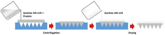 MN arrays were prepared using poly(methyl-vinyl-ether-co-maleic anhydride) (Gantrez® AN-119) (Mw = 200 kDa), whose physicochemical properties were characterized before [13] The procedure is illustrated in Figure 1. To prepare the MN arrays, 50 mg of a solution containing 30% (w/v) Gantrez AN-119 and 5 μg of the rLTB protein was poured into silicone micromolds. Each mold, 0.7 cm × 0.7 cm, contained 361 (19 × 19) conical-shaped micro-needles. Needle height was 500 μm and the width of each needle at the base was 300 μm. Subsequently, the molds were centrifuged at 2850× g for 15 min to fill the mold cavities. Finally, 50 mg of a 30% (w/v) Gantrez solution in deionized water was added to prepare a thicker baseplate containing no protein. Finally, MNs were dried at room temperature (RT) for 24 h and removed from the molds.