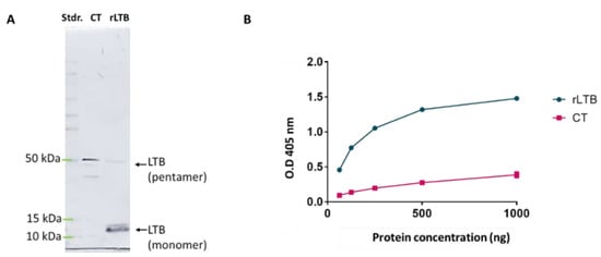 The recombinant histidine-tagged pET21-eltB expression plasmid was transformed to E. coli Stellar (Clontech) and further in E. coli BL21 (DE3) for recombinant protein rLTB expression. A single colony of E. coli BL21 transformed with pET21-eltB plasmid was inoculated into Luria-Bertani (LB) medium supplemented with ampicillin (100 µg/mL), followed by agitation at 120 rpm at 37 °C to reach an O.D.600nm of 0.6. Then, an inoculum was transferred to a 500 mL fresh LB medium and incubated at 37 °C with 120 rpm agitation overnight. Induction of the eltB gene expression was performed with the addition of 0.3 mL 1 M isopropyl β-d-1-thiogalactopyranoside (IPTG) at 16 °C. After 12 h incubation, the cellular pellet was collected (6000× g, 4 °C, 20 min) and resuspended in ice-cold lysis buffer containing protease inhibitors (100 mM PBS, pH 7.5, 200 mM NaCl, 20% glycerol, protease inhibitor, Roche) and lysed with a high-pressure French Press (SIM AMINCO) at 14.000 psi; twice. The supernatant was collected following centrifugation at 20,000× g for 20 min.
