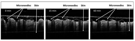 Ex vivo insertion studies were performed in excised neonatal porcine skin, as it is a good model for human skin [17]. MN insertion and dissolution were evaluated using optical coherence tomography. MNs prepared using Gantrez AN-119 were dissolving as reported previously by Pastor et al. [12]. Figure 4 shows MN dissolution inside porcine skin, which indicates that MNs fully dissolved within 15 min of application. These results are in line with previously-reported MN arrays prepared using the same polymer.