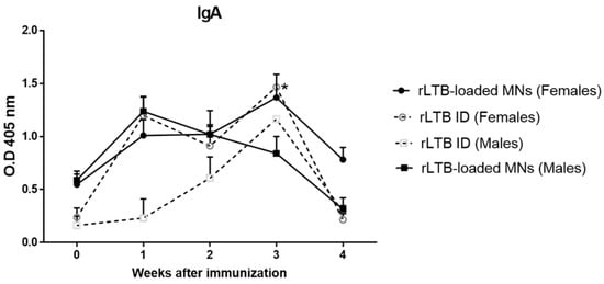 rLTB-specific IgA antibodies in immunized mice. BALB/c mice (females and males) (n = 5) were immunized by intradermal (ID) or MN arrays with 5 μg of recombinant of heat-labile enterotoxin B (rLTB) from Enterotoxigenic Escherichia coli (ETEC) H10407 (ATCC 35401). Specific IgA antibodies against rLTB in mice serum were determined by GM1-ELISA (* p < 0.05 vs. pre-immunization time). Error bars represent S.D.