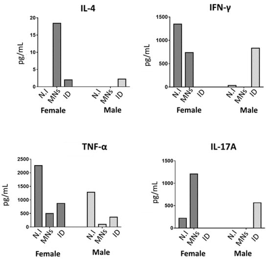 Splenic cytokine profile in immunized BALB/c female and male mice with rLTB-loaded microneedle patches (MNs) or with rLTB through intradermal route (ID). Non-immunized (N.I) mice were used as a negative control. Cytokine levels were determined by ELISA and expressed in pg/Ml.