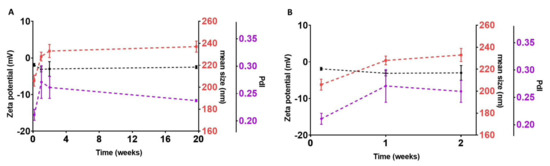 (A) Stability of the selected unloaded SLNs formulation at days 1, 7, 14 and 138. An enlargement of the first 14 days is presented in (B). Black line: Graphical representation of variations in ZP values (data plotted on the left Y-axis); Red line: Graphical representation of variations in mean sizes (data plotted on the first right Y-axis); Purple line: Graphical representation of variations in PdI values (data plotted on the second right Y-axis). Results are given as mean ± SD (n = 3).