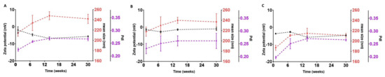 Stability of the SLNs (composed by the solid lipid Compritol® HD5 ATO 345 and the emulsifier Pluronic-F127) loaded with (A) EGCG, (B) resveratrol or (C) myricetin. Black line: Graphical representation of variations in ZP values (data plotted on the left Y-axis); Red line: Graphical representation of variations in mean sizes (data plotted on the first right Y-axis); Purple line: Graphical representation of variations in PdI values (data plotted on the second right Y-axis). Results are given as mean ± SD (n = 3).