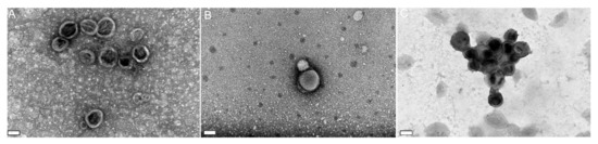 TEM images of the (A) EGCG-loaded, (B) resveratrol-loaded and (C) myricetin-loaded SLNs. The scale bar corresponds to 100 nm.
