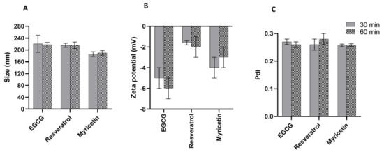 After selecting the most suitable formulation parameters, different SLNs loaded with the natural compounds—EGCG, resveratrol and myricetin—were prepared. The stability of the developed SLNs was evaluated for 30 days. The size, ZP and PdI of the loaded-SLNs were analyzed. In Figure 2, the mean and standard deviation (SD) of the size, ZP and PdI for each type of loaded SLN (EGCG, resveratrol and myricetin) is presented.
