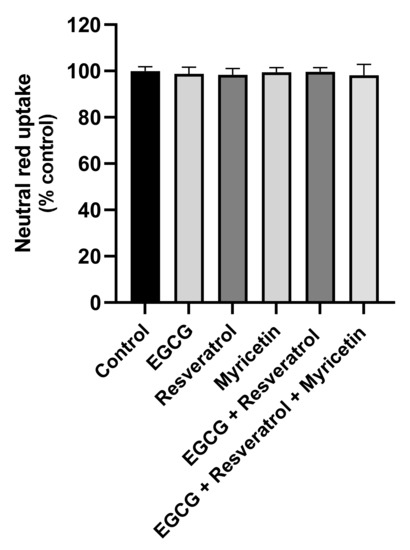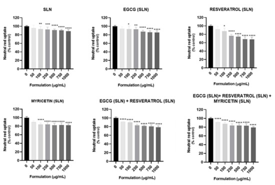 A concentration-dependent reduction in NR uptake was observed for all the formulations, including the unloaded formulation. In accordance with the obtained data, no significant cytotoxicity was detected after 24 h exposure to unloaded, or SLNs loaded with EGCG, resveratrol or myricetin at the SLN concentration of 50 µg/mL. However, a significant reduction in NR uptake was observed for concentrations equal or higher than 100 µg/mL. For the EGCG:resveratrol and the EGCG:resveratrol:myricetin SLNs formulations, a significant reduction in the NR uptake was detected for all the tested concentrations. However, although significant, the NR uptake observed 24 h after exposure to the EGCG:resveratrol and EGCG:resveratrol:myricetin SLNs formulations at the 50 µg/mL concentration was always higher than 90%, when compared to control cells ((0 µg/mL) (NR uptake significantly decreased to 91.8% and 91.7% 24 h after exposure to 50 µg/mL EGCG:resveratrol and EGCG:resveratrol:myricetin SLNs formulations, respectively).