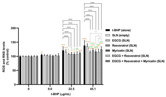 As shown in Figure 8, t-BHP induced a significant and concentration-dependent increase in ROS/RNS intracellular levels for both 6 and 24 h after exposure. For 9.0 µg/mL t-BHP, it was verified that none of the loaded NLCs present an antioxidant effect against t-BHP-induced oxidative stress since a significant decrease in ROS/RNS levels was not observed. Furthermore, the simultaneous exposure to t-BHP and loaded SLN formulations at 22.5 µg/mL and 45.1 µg/mL resulted in a significant decrease in ROS/RNS production when compared to t-BHP alone, suggesting a protective antioxidant effect of these SLNs formulations against t-BHP-induced oxidative stress. That effect was more pronounced at 24 h after exposure, attesting that the formulation was more efficient after 24 h of contact with cells. From the treatment with only one compound-loaded SLNs formulation, the EGCG-loaded SLNs formulation was considered the most effective in decreasing ROS/RNS production. In addition, from all the SLNs-loaded formulations, the EGCG:resveratrol combination was responsible for the highest protection against t-BHP-induced oxidative stress. As expected, the unloaded SLNs formulation was not able to decrease the t-BHP-induced ROS/RNS production, suggesting that the observed protective effects observed for all the formulations seem to be a result of the antioxidant effects of the loaded natural compounds.
