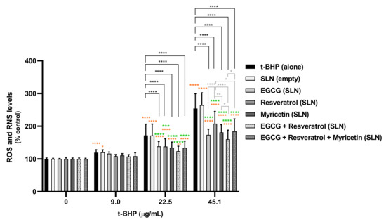 Intracellular levels of ROS/RNS evaluated in HaCaT cells 24 h after exposure to t-BHP (0–45.1 µg/mL) in the presence or absence of the developed SLN formulations. Results are expressed as mean ± SD from six independent experiments performed in triplicate. Statistical comparisons were made using two-way ANOVA followed by Tukey’s multiple comparisons test (* p < 0.05, ** p < 0.01, *** p < 0.001; **** p < 0.0001; orange represents the statistical analysis for each condition versus 0 µM t-BHP; green represents the statistical analysis at each t-BHP concentration for the comparison between NC-loaded SLN formulations and the unloaded SLN formulation; black represents the statistical analysis at each t-BHP concentration for the comparison between each SLN formulation and t-BHP alone; grey represents the statistical analysis at each t-BHP concentration for the comparison between the different NC-loaded SLN formulations). In all cases, p-values < 0.05 were considered significant.
