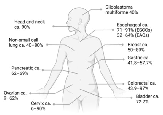 The positivity proportions of EGFR expression in various cancers (ca., carcinoma; ESCC, esophageal squamous cell carcinoma; EAC, esophageal adenocarcinoma). Adapted from Kato et al., Cancers, published by MDPI in 2021. Created with BioRender.com.