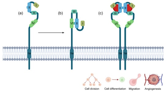 EGFR structure and conformation: (a) open conformation (active) and (b) closed conformation (inactive); (c) the ligand binding drives EGFR dimerization and activates the signaling cascade, with consequent stimulation of cell division and differentiation, as well as migration and angiogenesis. Created with BioRender.com.
