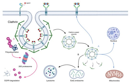 In clathrin-mediated endocytosis, which is the main EGFR internalization pathway, EGFR is internalized by the formation of clathrin-coated intracellular vesicles that are then fused with early endosomes. At this step, ligand-free receptors can be recycled to cell surfaces while EGFR–ligand complexes are routed to late endosomes and then to lysosomes for degradation [,,]. In the proteasome pathway the E3 ligase Cbl, in complex with the adaptor protein Grb2, recognizes the phosphorylated tyrosine at the C-tail of EGFR and induces polyubiquitination of EGFR receptor, which is further degraded via the 26 s proteasome [,]. Alternatively, EGFR can be internalized via a clustering-induced mechanism that is mediated by the dimerization motif in the transmembrane domain []. It was also demonstrated that activated EGFR can escape degradation and be recycled in the plasma membrane or tagged to cellular organelles, such as mitochondria (either on the inner and outer membrane) and nuclei [,,,]. Once translocated within these organelles, EGFR acquires novel functions and can be involved in transcriptional regulation by acting as a co-transcriptional factor, DNA double-strand break repair, mitochondrial dynamics, and ATP production [,,,,]. In general, nuclear and mitochondrial EGFR localization is associated with severe prognosis in patients with lung, ovarian, breast, and oropharyngeal cancers [,,].