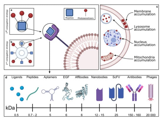 PDT conjugation strategies and targeting agents. (a) Direct conjugation of a PS to an EGFR-targeting agent. (b) Surface modification of a nanovector, incorporating a photosensitizer payload with EGFR-targeting agents. (c) Cellular localization of PSs after interaction between the targeting agent and EGFR receptor. (d) Different targeting agents used in EGFR-targeted PDT and their dimension in kDa. Created with BioRender.com.