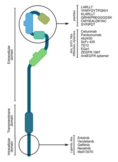 Disruption or downregulation of aberrant EGFR activity has been shown to have potent antitumor effects. Monoclonal antibody treatment, readily followed by small-molecule inhibition of the receptor kinase signaling activity, was demonstrated to be an excellent targeting therapy, paving the road for the upsurge of many nanobiotechnological strategies, also involving peptides, aptamers, single-chain (scFv) and single-domain antibodies (sdAb, nanobodies), as well as other non-immunoglobulin folds (DARPins, Affibodies, etc.) as targeting moieties.