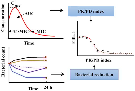 The pharmacokinetic/pharmacodynamic (PK/PD) model is a recognized tool for determining the dosage regimen and guiding clinical medication. The PK/PD model of antimicrobial agents can describe the triangular relationship between the potency of a drug against a micro-organism, subject exposure to a drug, and drug effects [] and contributes to the adjustment and optimization of dosage regimens, aiming to provide enough antibacterial effect for an infection caused by drug-resistant bacteria []. The PK/PD model of antimicrobials has been categorized by three PK/PD indices, which are comprised of a summary endpoint of drug exposure correlated with the minimum inhibitory concentration (MIC). The standardized notations for the PK/PD indices are AUC0–24h/MIC, Cmax/MIC, and T > MIC, where AUC0–24h/MIC is the ratio of the area under concentration related to the MIC within a 24 h period, Cmax/MIC is the maximum concentration related to the MIC, and T > MIC is the cumulative percentage of the 24 h that the concentration is above the MIC. Over recent decades, the PK/PD indices have been applied as a cornerstone of dose selection for antibiotics; however, this approach is associated with several drawbacks: