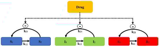 Aranzana-Climent et al. [] also employed Model 8 as the PD sub-model to describe the resistant mechanism. The drug interaction sub-model is described as Equation (36), as PD parameters are influenced by the presence of the other drug: